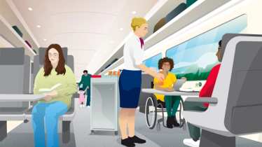 Alle unsere Rollstuhlplätze befinden sich in den Reiseklassen Standard Premier und Business Premier. Sie profitieren also von mehr Platz sowie von einer Mahlzeit und Getränken, die während der Fahrt serviert werden - allesamt zum festen Tarif für Rollstuhlplätze. Außerdem können Sie eine Begleitperson einladen, die zum ermäßigten Tarif mitreist.