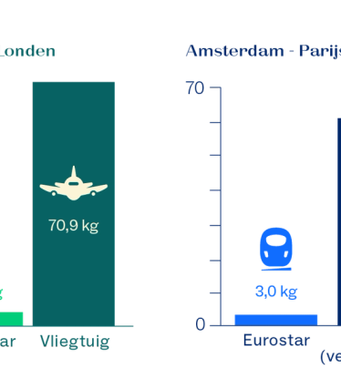**de CO₂-uitstoot per trein is op dit traject 95% lager dan een vliegtuig.