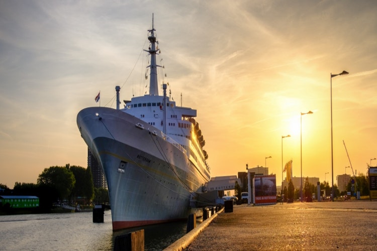 SS Rotterdam ligt aangemeerd naast de haven in het Katendrecht gebied. Voor gasten is er een gratis pendeldienst tussen het schip en metrohalte Rijnhaven, die je in een paar minuten naar het centrum van Rotterdam brengt. Rotterdam Centraal Station ligt op 12 minuten lopen, wat handig is voor wie verder wil reizen.