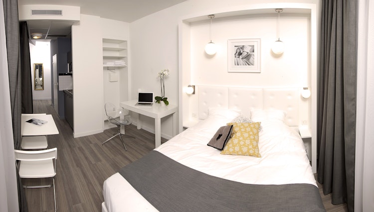 At CALM Appart Hotel, a cosy bedroom, a working desk space, a kitchenette and a practical bathroom awaits you. For your comfort, all rooms feature a TV, telephone, air-conditioning, wi-fi, in-room safe and a hairdryer.