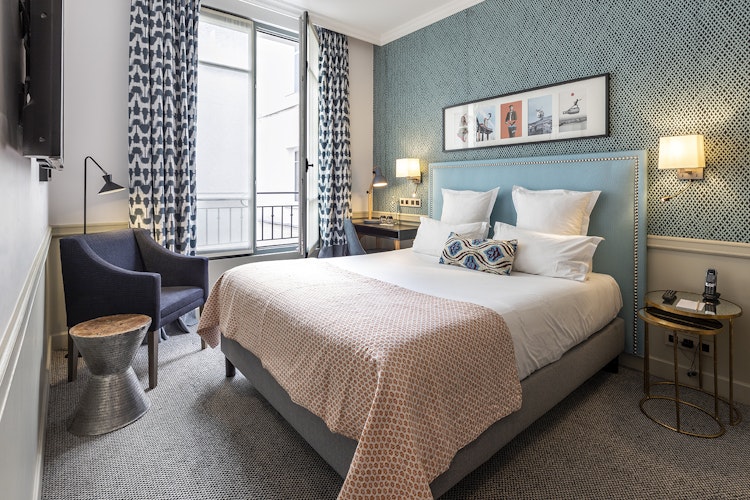 Each of the beautifully designed rooms blends classic Parisian style with contemporary comfort: soft fabrics, curated artwork and thoughtful touches that invite relaxation after a day exploring the city. Some rooms open onto charming balconies — perfect for a morning coffee or an evening glass of wine.
